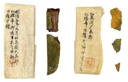 Their hometown was recognized by the unique paper wrappings with the handwritten labels and seal of Kaichiro Kashiwagi, the builder who explored and patched up the tomb after a landslide uncovered the ahead part and collapsed its stone chamber in 1872. As a royal tomb, it was not open to excavation, so Kashiwagi documented what he discovered inside — knives, armor, helmets, sword fittings, glassware — earlier than backfilling it. Till the objects emerged in the marketplace final yr, the grave items might solely be seen in Kashiwagi’s illustrations.