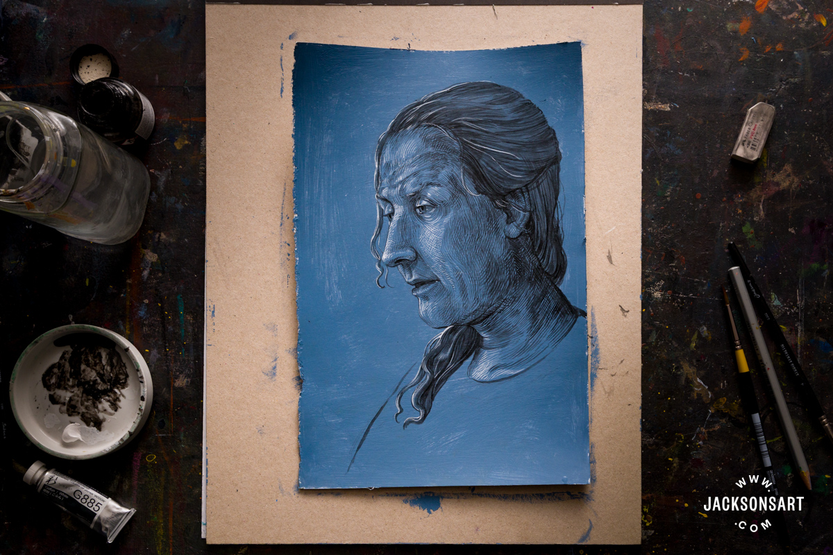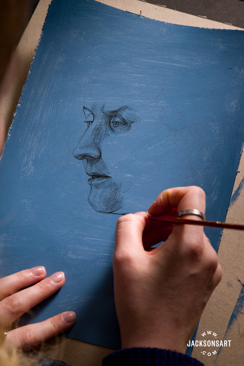For my instance of a Dürer impressed blue-toned chiaroscuro drawing, I ready a few sheets of Jackson’s Bockingford Watercolour Sizzling Press Paper with Jackson’s Skilled Acrylic Paint combined with Jackson’s Acrylic Gesso Primer. Then I drew with Sennelier Indian Ink and Holbein Acrylic Gouache Paint in Titanium White utilizing superb Willow Wolfe Callia Brushes.