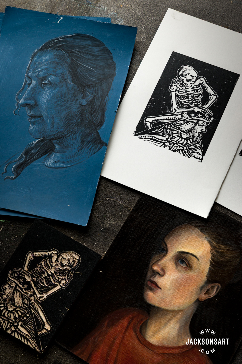 As I described beforehand on this article, Albrecht Dürer elevated printmaking by bringing a brand new stage of refinement to wooden engraving – his works are thought of incomparable for this era, however many different artists made woodcuts and wooden engravings throughout this period as nicely. Considered one of these was Hans Holbein the Youthful, whose Tudor portraiture I described intimately above. He labored on a e-book of 41 small woodcuts in his twenties known as The Dance of Demise – the place stylised skeletons push and pull folks towards their doom. His sinister, lurking depictions of Demise assert that he comes for us all – no matter standing or wealth. For the next instance I made my very own woodcut impressed by the skeleton clinging to royalty in The Emperor.