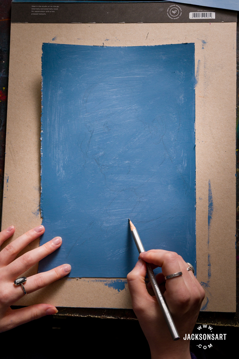 To start I combined collectively French Ultramarine Blue with a contact of Yellow Ochre, and mixed them with Jackson’s Acrylic Gesso Primer to create my ready floor. I utilized it to my paper with a broad brush and let it absolutely dry.