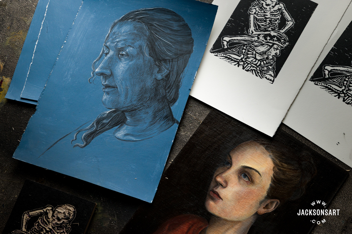 For my instance of a Dürer impressed blue-toned chiaroscuro drawing, I ready a few sheets of Jackson’s Bockingford Watercolour Sizzling Press Paper with Jackson’s Skilled Acrylic Paint combined with Jackson’s Acrylic Gesso Primer. Then I drew with Sennelier Indian Ink and Holbein Acrylic Gouache Paint in Titanium White utilizing superb Willow Wolfe Callia Brushes.