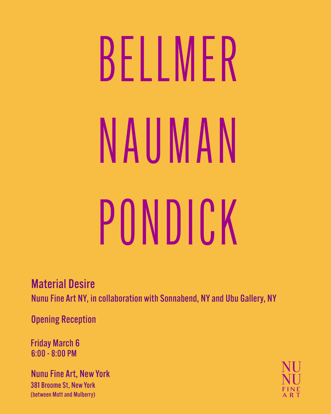 Nunu High-quality Artwork in New York will current Bellmer Nauman Pondick: Materials Need from 6 March to 30 Might 2026. Organised in collaboration with Sonnabend and Ubu Gallery, the exhibition brings collectively works by Hans Bellmer, Bruce Nauman and Rona Pondick, tracing a cross-generational dialogue across the physique as topic and materials.