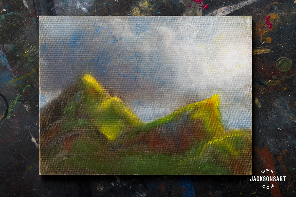 Translating this right into a completed portray on canvas board, I discovered the portray expertise fairly completely different. Whereas the watercolour paper held on to color, permitting color constructing and mixing, the canvas board had extra resistance. Underpainting was a delight, with color readily shifting and lifting with manipulation. Drawing into the floor labored properly to a degree; nevertheless, I discovered that some colors (Cobalt Blue and Cadmium Yellow Mild) would minimize proper again to the floor reasonably than readily mixing with the color already there. I used drawing on the floor quite a bit to put color and construct deliberate marks and texture, however I additionally reached extra continuously for a spread of brushes and launched some oil portray medium and solvent.