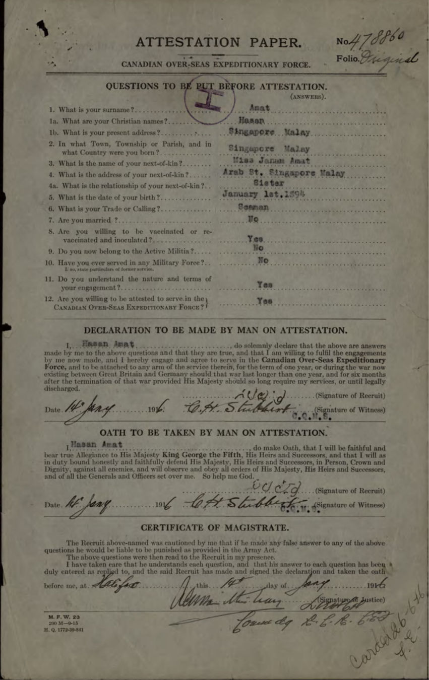Non-public Hasan Amat’s first attestation paper, accomplished in Halifax in January 1916. Library and Archives Canada, Personnel File of Non-public Hasan Amat (Reg. Nos. 478860 & 1075269).