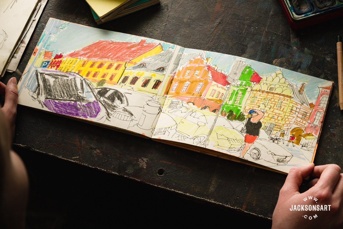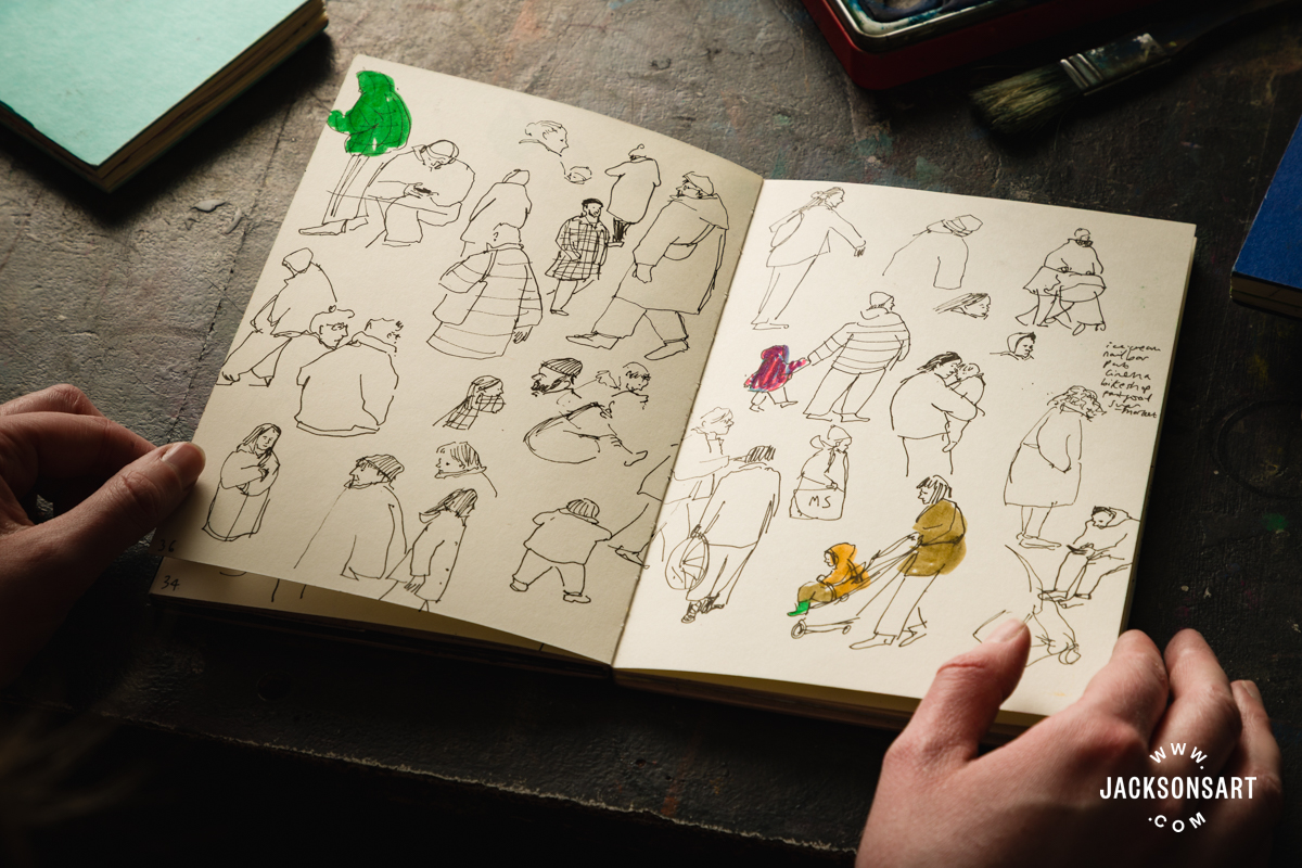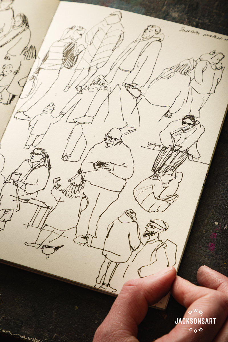 I often work in just a few sketchbooks on the identical time. Small sketchbooks are good for sketching individuals in cafes or on public transport, and longer, bigger sketchbooks are greatest for capturing entire scenes and landscapes.