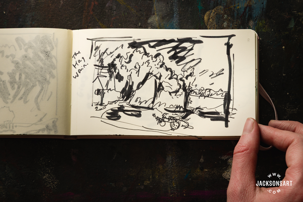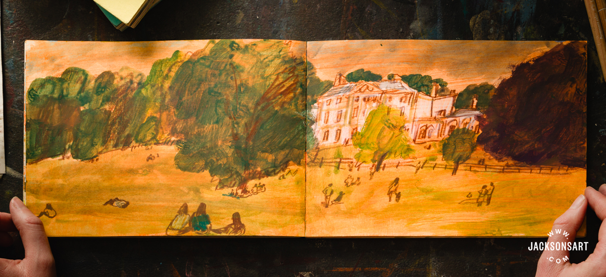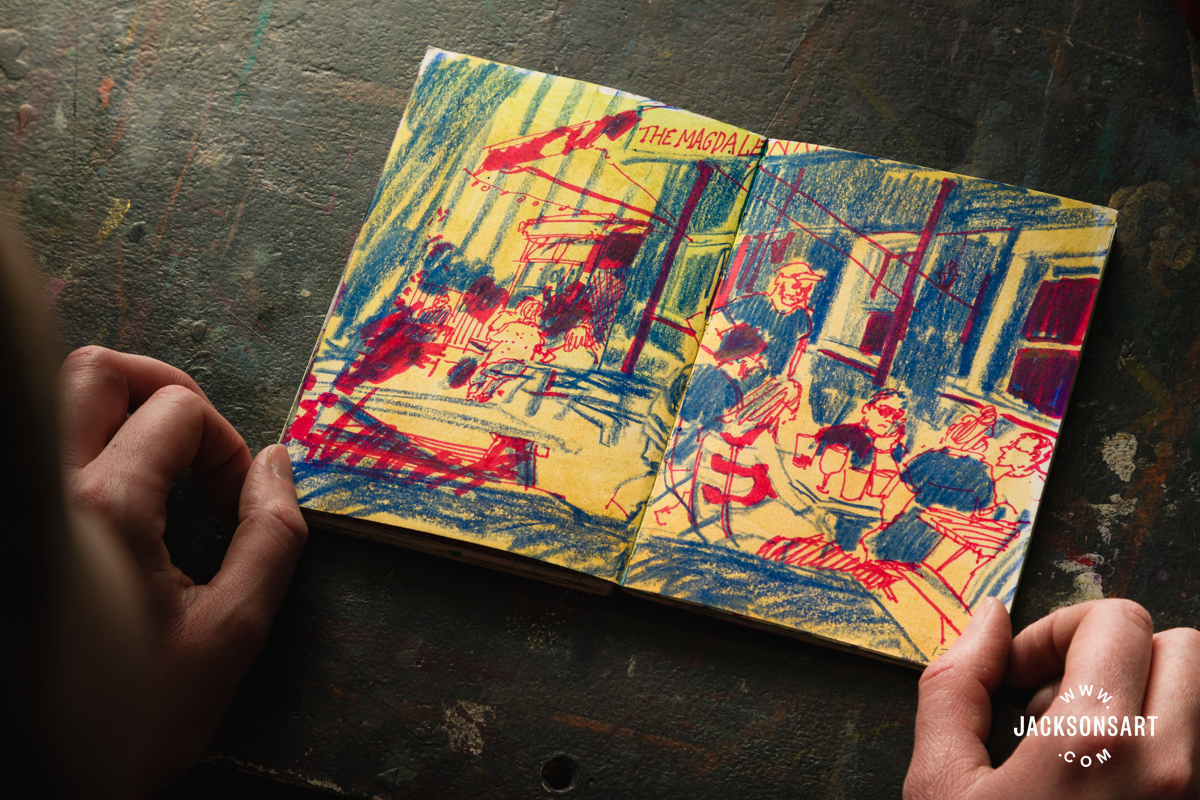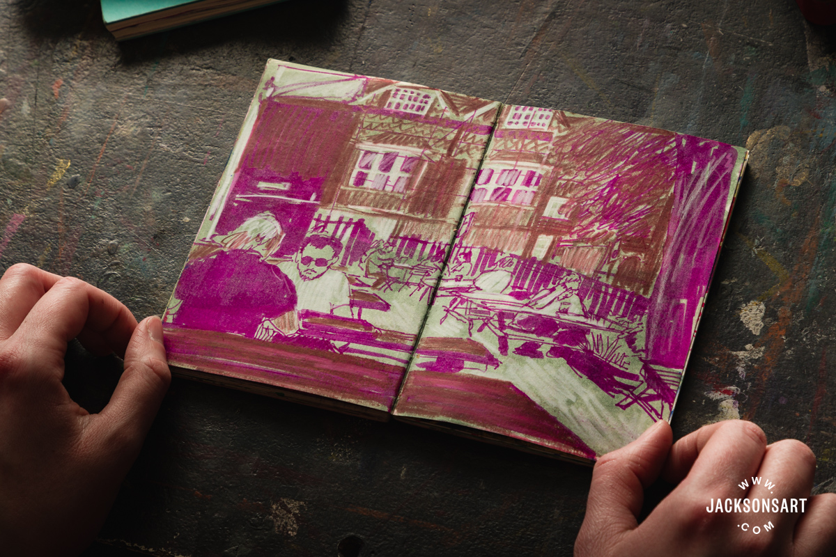 I often work in just a few sketchbooks on the identical time. Small sketchbooks are good for sketching individuals in cafes or on public transport, and longer, bigger sketchbooks are greatest for capturing entire scenes and landscapes.