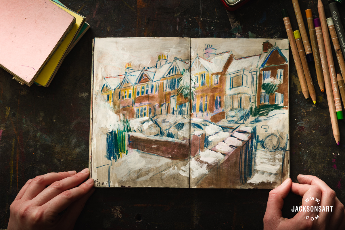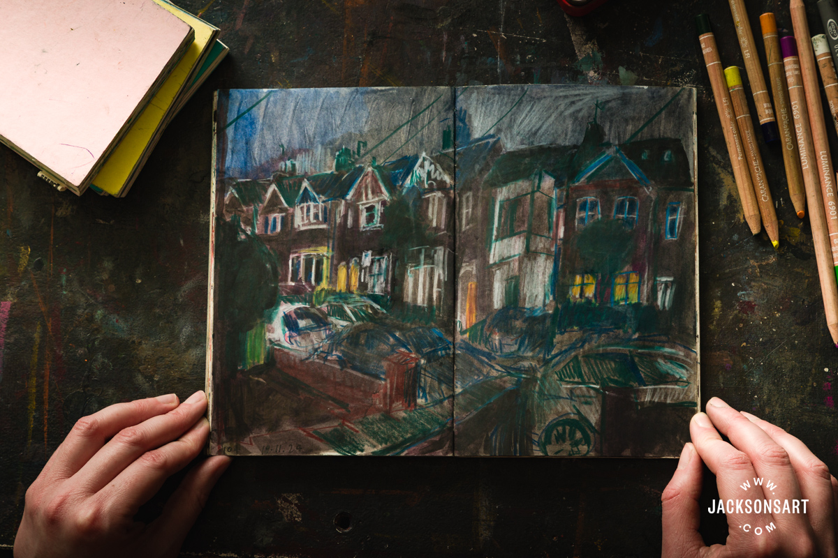 Though drawing in a brand new place is thrilling, I significantly get pleasure from drawing the locations I do know properly. In my sketchbooks, I’ve drawn the identical view of my avenue at completely different occasions of day, climate circumstances and utilizing completely different supplies.