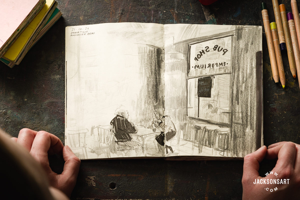 Going drawing with mates is an efficient strategy to acquire confidence in drawing from life. I’ll usually deliver a sketchbook to the pub or a restaurant and draw with mates.