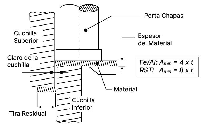 Al igual que en una cizalla de guillotina tradicional, la cizalla de ángulo recto de la máquina combinada de punzonado/cizallado utiliza sujetadores para evitar que la pieza se deforme durante el corte. Los sujetadores tienen menos de 12.7 mm (0.5 pulg) de ancho y están biselados para adaptarse a lanzas, rejillas u otras formas que puedan estar cerca de los bordes izquierdo y superior de la pieza. Si las formas están demasiado cerca del borde (por ejemplo, a menos de 16 mm) (0.63 pulg), la cizalla puede deformarlas (véase la Figura 3).