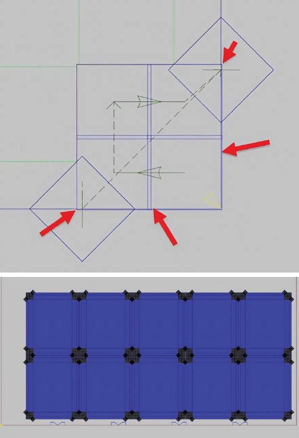 El corte de línea común es especialmente beneficioso en la cizalla / punzonadora, pero es necesario asegurarse de lograr una buena calidad de borde. Esto requiere una mínima separación entre el filo de la herramienta y el borde de la pieza que se va a cortar. Cortar directamente sobre el borde de una pieza puede crear pequeñas astillas (a veces solo un pelo) que pueden degradar la calidad del borde y, sobre todo, hacer que las piezas cortadas sean menos seguras de manipular. Esto significa que se necesita una mínima separación al cortar una línea común entre dos bordes de piezas. Esto puede generar problemas al anidar muescas comunes que crearán las pestañas que posteriormente se convertirán en paneles o cajas. Para evitar problemas en los bordes, se programa el punzón cuadrado para que se expanda e invada el área de la muesca (aproximadamente 0.5 mm, (0.020 pulg) dependiendo del área y el materials). Esta estrategia de expansión de la muesca proporciona al anidamiento la holgura necesaria para que las herramientas no corten directamente sobre el borde de la pieza, lo que garantiza una calidad de borde óptima que los operarios de la prensa dobladora apreciarán (véase la Figura 5).