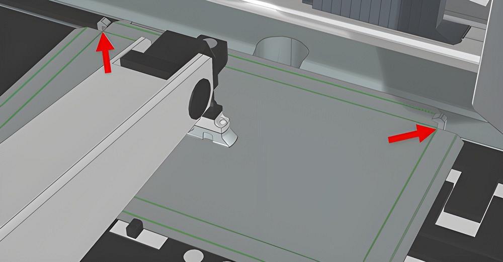 FIGURA 3. La cizalla de ángulo recto incorpora un sujetador de chapa que sujeta el materials durante el corte. El sujetador se puede programar para que no se energetic en ciertas zonas, para así poder trabajar con lamas u otras formas cerca del borde. Por supuesto, la solución más sencilla sería evitar por completo las formas cercanas al borde.
