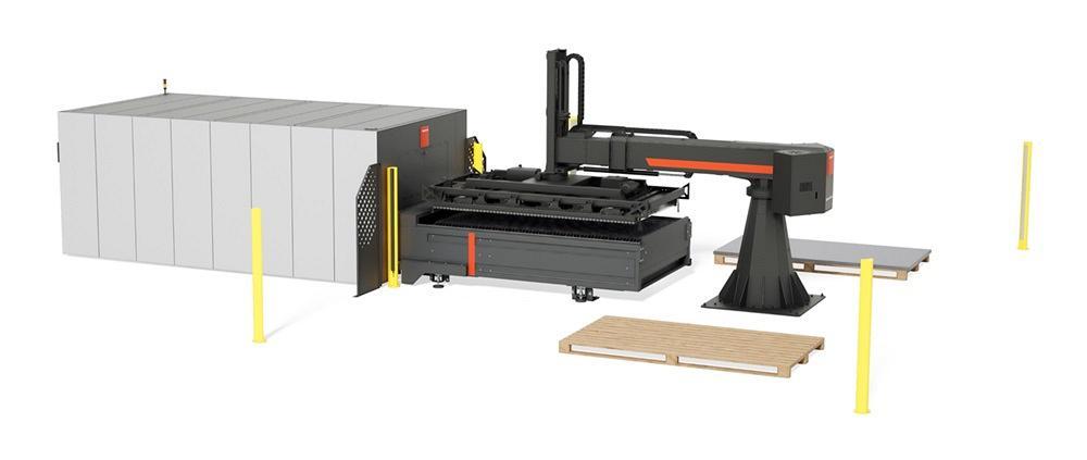 El ByLoader Flex de Bystronic simplifica las operaciones de corte por láser de fibra. Desde los palés de materials ubicados junto a la mesa de transporte, la unidad permite cargar la materia prima en la mesa de transporte y descargar la chapa cortada en los palés de descarga de forma rápida y automática. Según la configuración del diseño, la máquina puede utilizar una combinación de dos a cinco posiciones de palés.