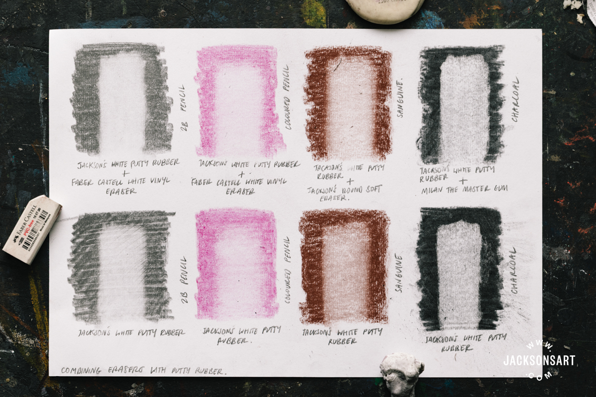 Putty erasers aren’t the perfect for fully lifting pigment from a floor, so it may be finest to make use of a putty rubber to carry off the preliminary dusty materials layer, earlier than gently refining the erased space with a tough eraser. Within the following sheet I examined erasing strips of 2B pencil, Faber-Castell Albrecht Durer Watercolour Pencil in Mild Purple Pink, Conté à Paris Sanguine Pencil and Coates Willow Charcoal. For every swatch I’ve proven the outcomes with the putty rubber alone on the underside row, and the outcomes mixed with one other eraser on prime. For each materials, the mixture of the putty rubber with one other eraser was more practical than the putty rubber alone.