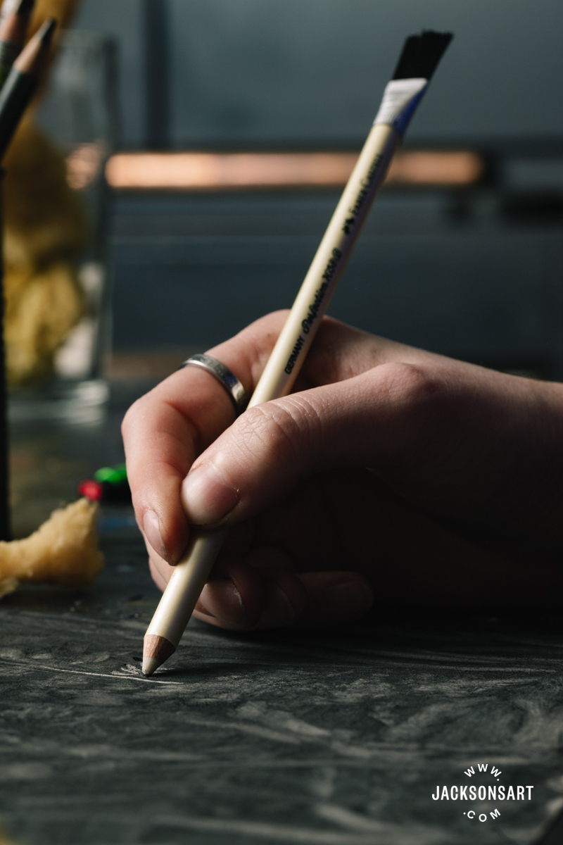 I used the eraser pen to rigorously pick the highlights across the eye on my charcoal portrait, and loved having the ability to maintain the eraser with precision. It might be a lot clumsier to make use of a tiny piece of rubber pinched in my fingers.