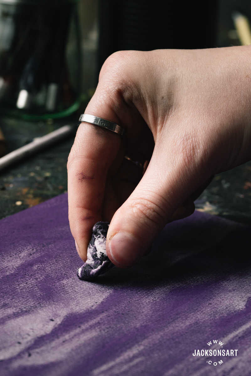For my second instance in pastel, I lined a sheet of muted blue pastel paper in a Darkish Lilac Jackson’s Handmade Comfortable Pastel, and blended it evenly with a scrap piece of paper. Subsequent I used a chunk of putty rubber to erase the pastel to type clouds blanketing mountains, with only a few peaks exhibiting by means of.