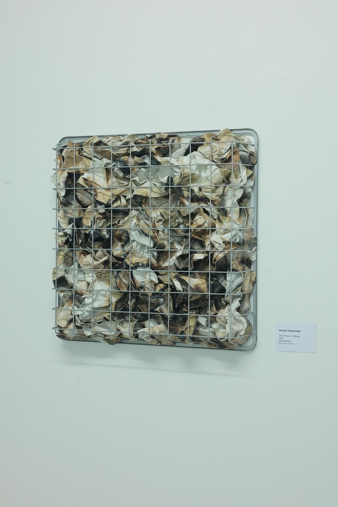 The works don’t recommend a transparent narrative path. Two wall mounted assemblage items sit dealing with one another and are contained by inflexible steel grids. Compressed natural matter – dry leaves, fragments, darkened stays, press up in opposition to the latticework, frozen mid-fall. One piece features a round object that resembles a steering wheel or mechanical ring and though its inclusion appears purposeful, its significance continues to be ambiguous. Though management, movement, and path are all advised, they’re all thwarted by being contained and motionless.