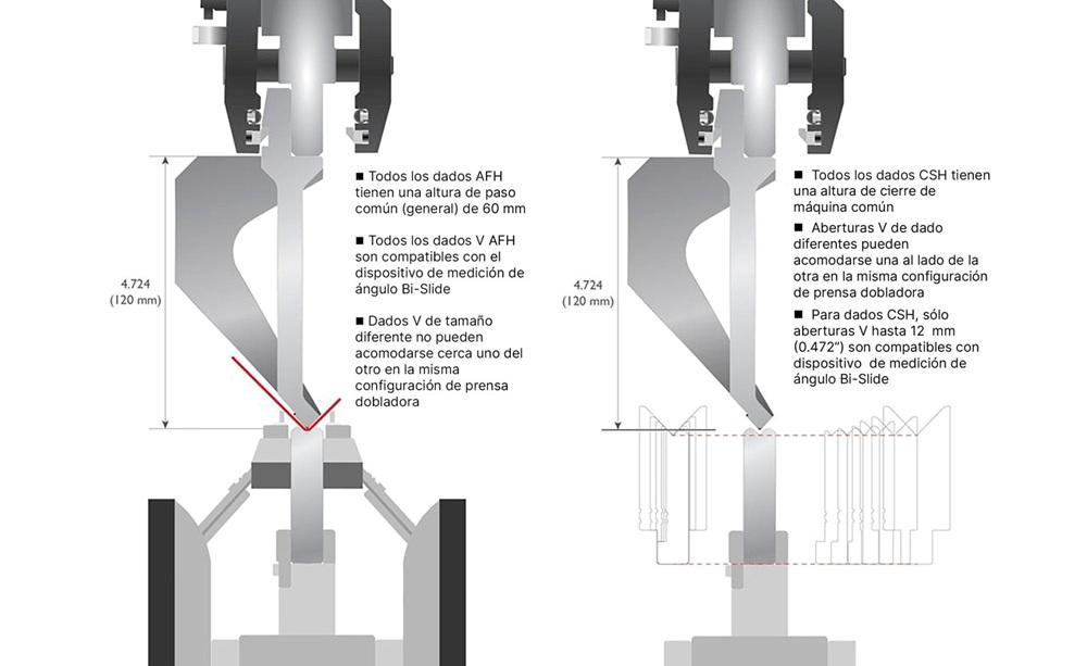 Los punzones de altura fija tienen una altura de paso común. Combinados con dados de altura de cierre común (derecha), juegos de herramientas con diferentes aberturas V pueden acomodarse uno al lado del otro.