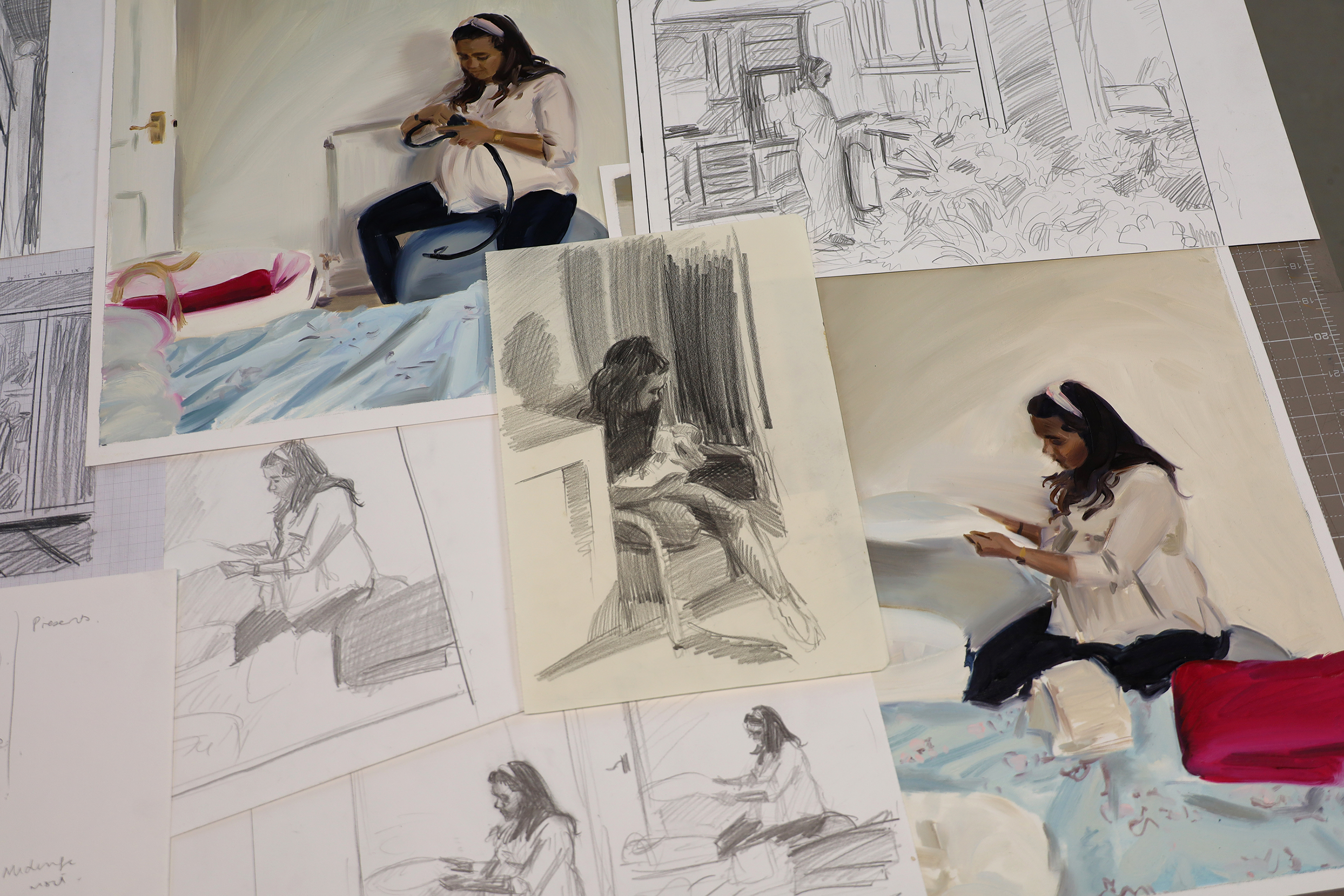 Caroline: In some ways, what I used to be making then doesn’t look that completely different to the work that I make now. There’s all the time figures in interiors. However I used to be actually beginning to suppose, at that stage, about all of the work that I’d loved taking a look at most, which have been all the time work of girls, typically in home settings, and the way almost all of them have been painted by males. So I started to consider how I, as a feminine artist, may revisit these topics from a feminine perspective and in a up to date context.