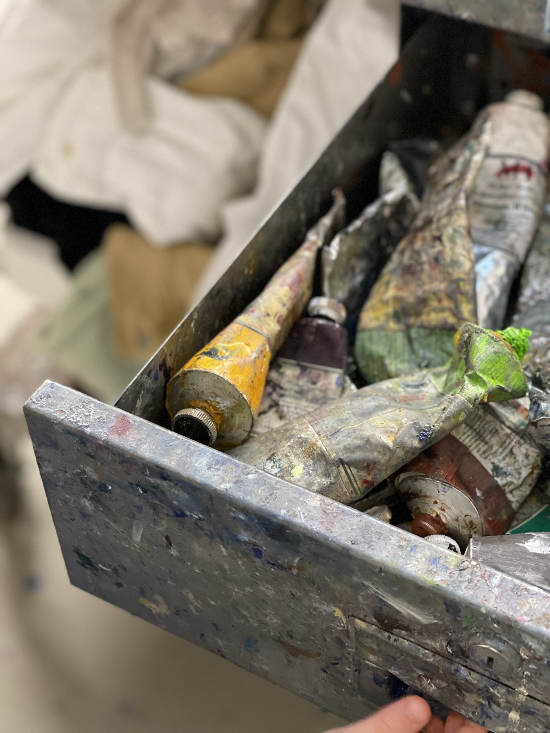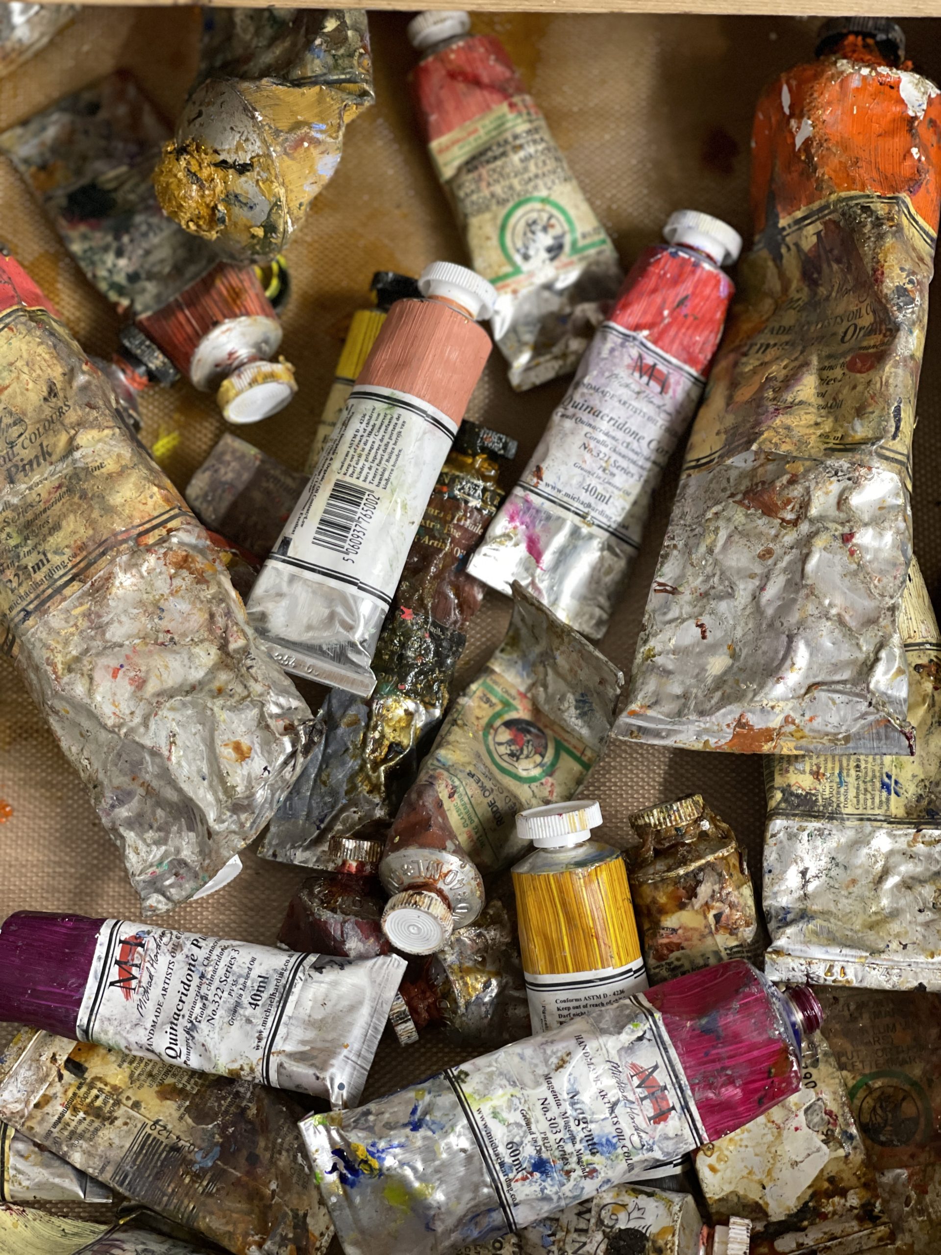 Caroline: There isn’t actually a typical working day for me within the studio nowadays as a result of I’m balancing working from dwelling, typically with childcare or form of different fixed interruptions, I suppose, actually. However the superb working day for me would begin at about 9 thirty within the morning and go till about 5 o’clock. And to get in the fitting mindset, I suppose it’s making a espresso, perhaps placing the radio on, and simply making an attempt to get myself excited in regards to the day forward, about beginning a portray.