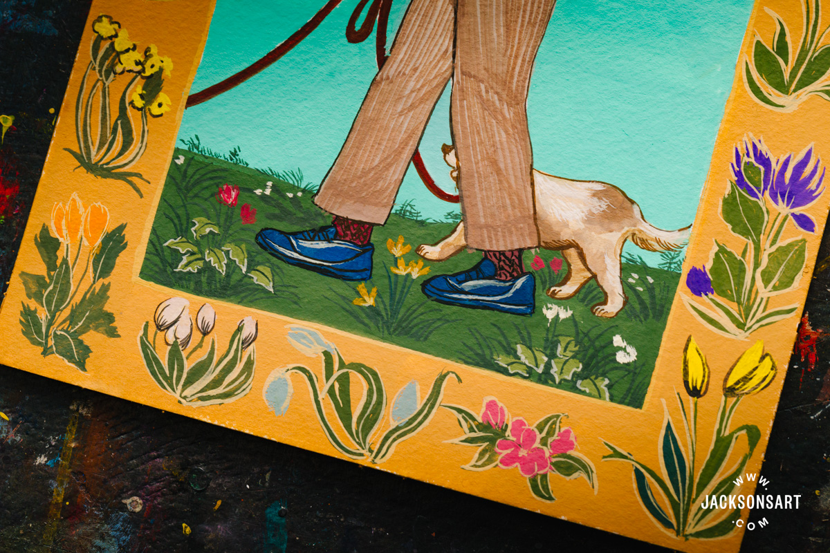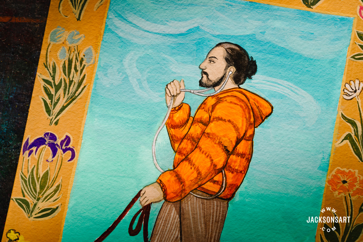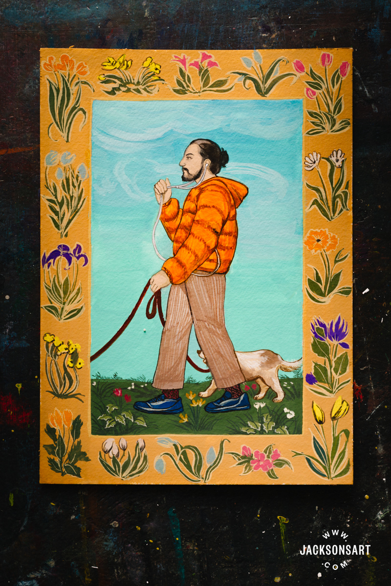 To display Mughal and Persian miniature portray, I made my very own impressed by the next portrait of Shah Jahan on Horseback. My model replaces the ruler with a up to date topic strolling his canine, to mirror the Mughal custom of capturing on a regular basis life of their courts. I painted my work utilizing Holbein Artists Gouache, in a palette meant to be a up to date imitation of Mughal colors, utilizing White, Bamboo Inexperienced, Elm Inexperienced, Black, Indigo, Bark Brown, Safflower Purple, Ultramarine, Scarlet, Orange Yellow, Edo Violet, Canola Yellow, and Amber, on a small 12.5 x 17.5cm sheet from a Jackson’s Chilly Pressed Watercolour Block.