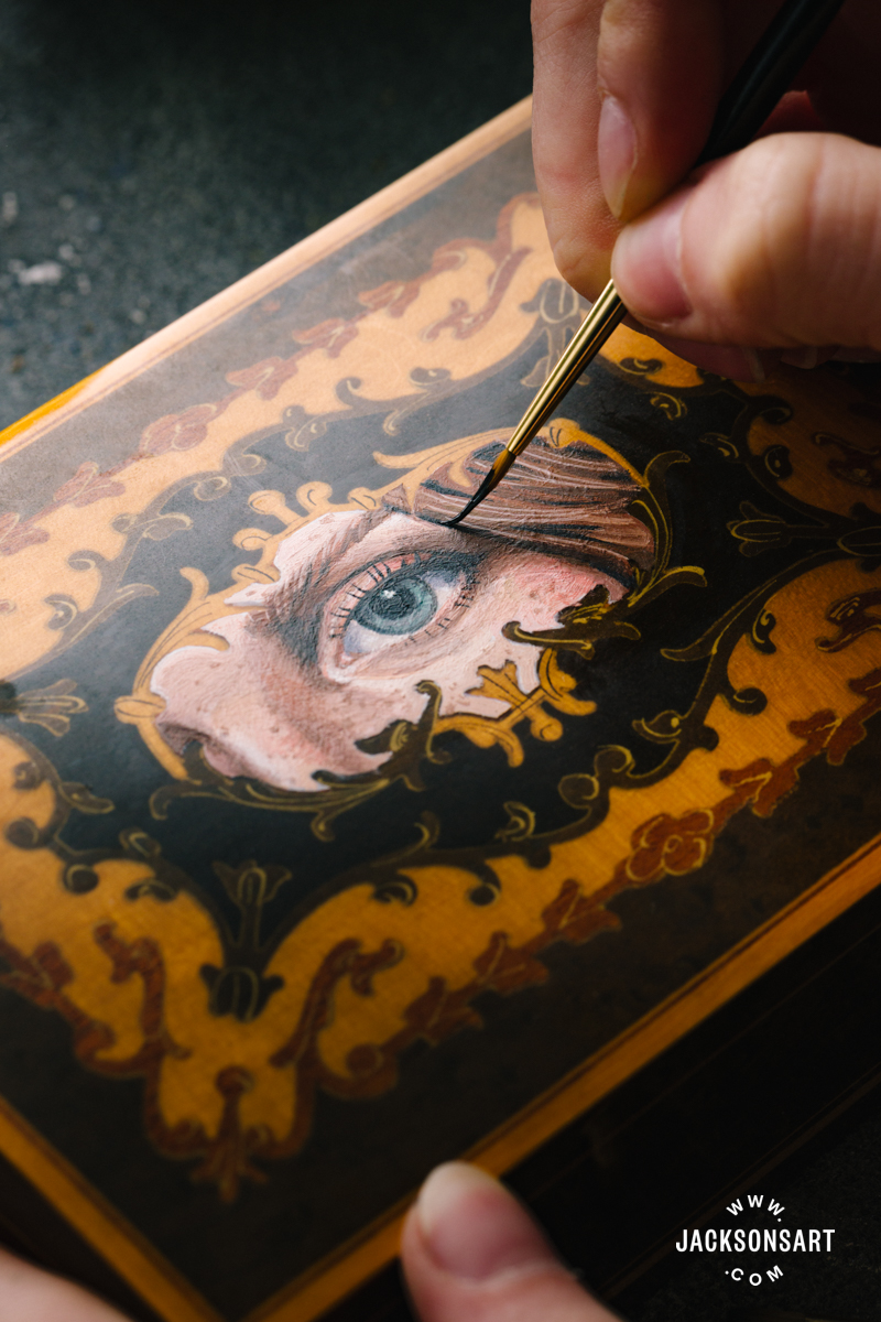 For my field, I evenly sanded the realm I needed to color on, for the reason that floor was very slick and easy. Then I rigorously painted a few skinny layers of gesso onto the part, so my paint had one thing to grip onto. I painted the Lover’s Eye utilizing Jackson’s Skilled Acrylic Paint and the identical small brushes from my earlier examples.