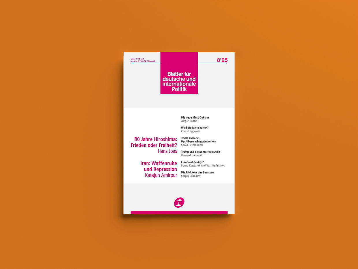 Blätter observes the eightieth anniversary of the dropping of the atomic bomb on Hiroshima and Nagasaki with an article by Hans Joas entitled ‘Peace or Freedom?’. In it the social thinker discusses the moral and political implications of the age of nuclear weapons by way of the prism of Karl Jaspers and Günther Anders.