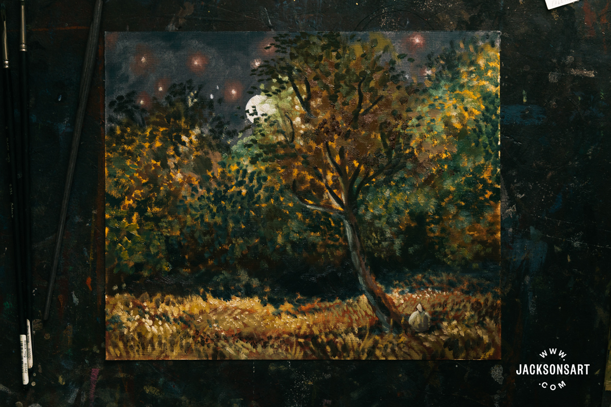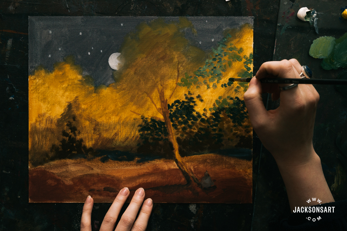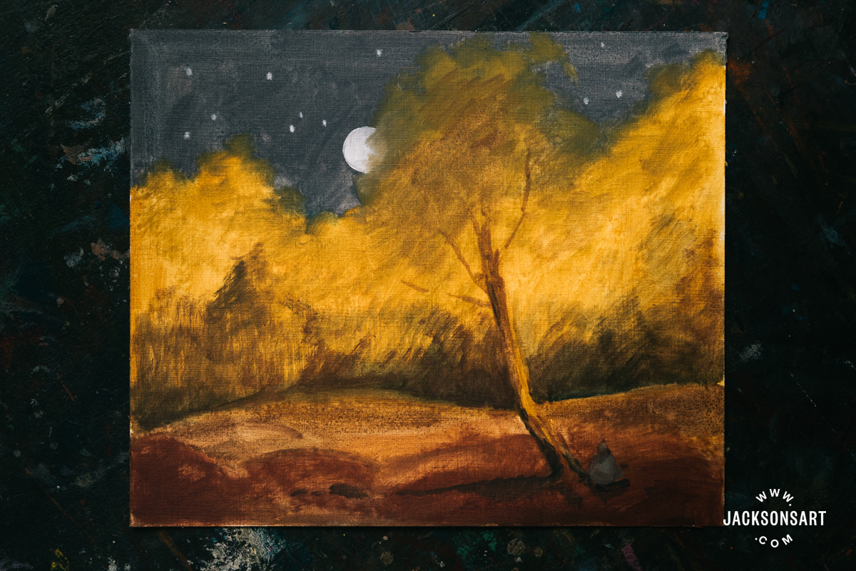 Within the foliage caught by the moonlight on the high of the timber, I left extra areas between my dabbing to permit the yellow underpainting to indicate by and counsel gentle.