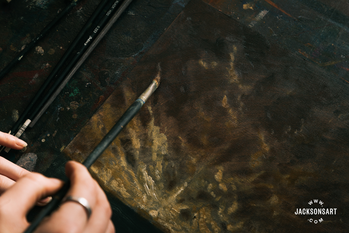 The ragged clouds and textured foliage wouldn’t be potential in Hannah Palmer’s Flight Into Egypt with out scumbling and dry brushing. To start my instance impressed by her portray, I blocked within the colors of a heavy brown sky and deep inexperienced panorama, illuminated by the low solar, utilizing the second instance palette of colors from my earlier instance. Identical to the dabbing, by blocking within the preliminary layer, the colors present by between the scumbling and dry brushing to create type and depth.