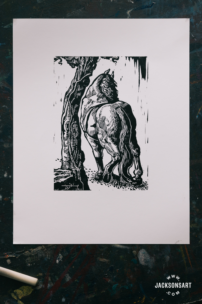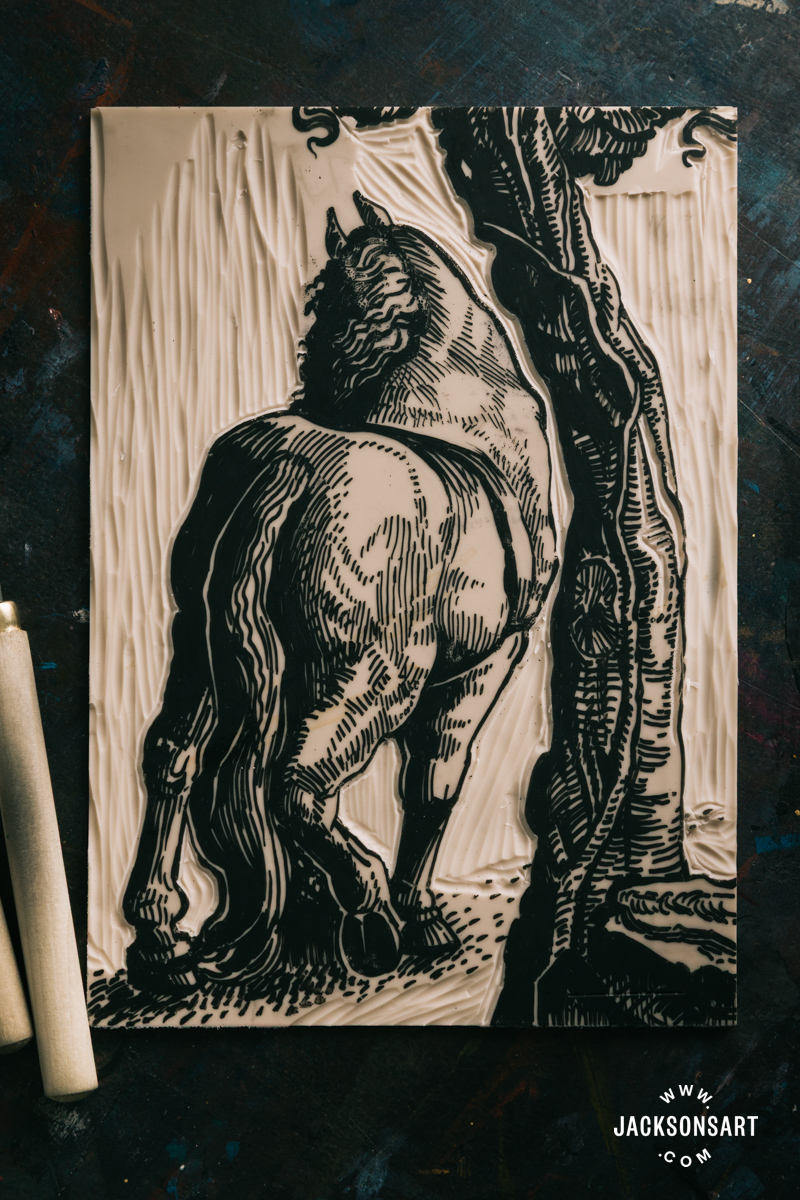 The Ancients’ most impactful printmaker was Edward Calvert, although he didn’t proceed printmaking past his time with The Ancients. His engravings are extremely intricate and wealthy with textured markmaking, with cautious hatching and stippling populating the floor. For my instance, I used to be impressed by the broad tonal vary and element in The Ploughman. I selected to create a simplified model of the horse on the best and the gnarled tree to make them work as a lino print. I used an Essdee Softcut Lino Block, a black Posca marker pen, and a Jackson’s Wooden Reduce Knife Set of 12.