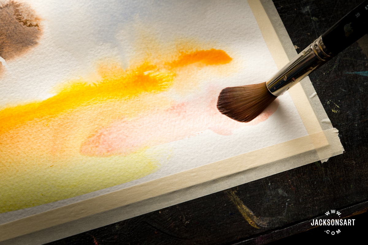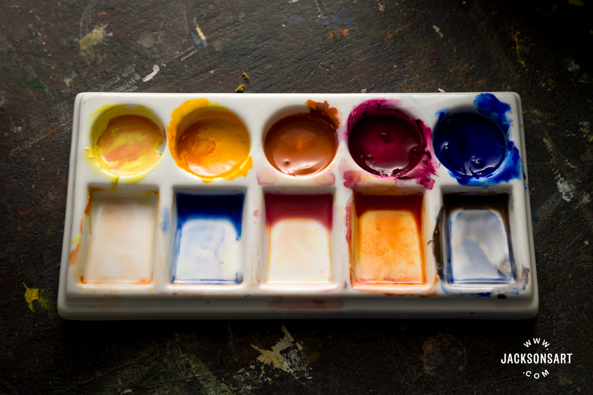 The number of pigments on this palette was additionally guided by their differing levels of transparency and opacity: Nickel Titanate Yellow and Orange Oxide are opaque; Ultramarine Blue is semi-transparent; and Quinacridone Pink and Indian Yellow are very clear. This interaction permits for each veiled, atmospheric layering and assertive, body-colour passages.