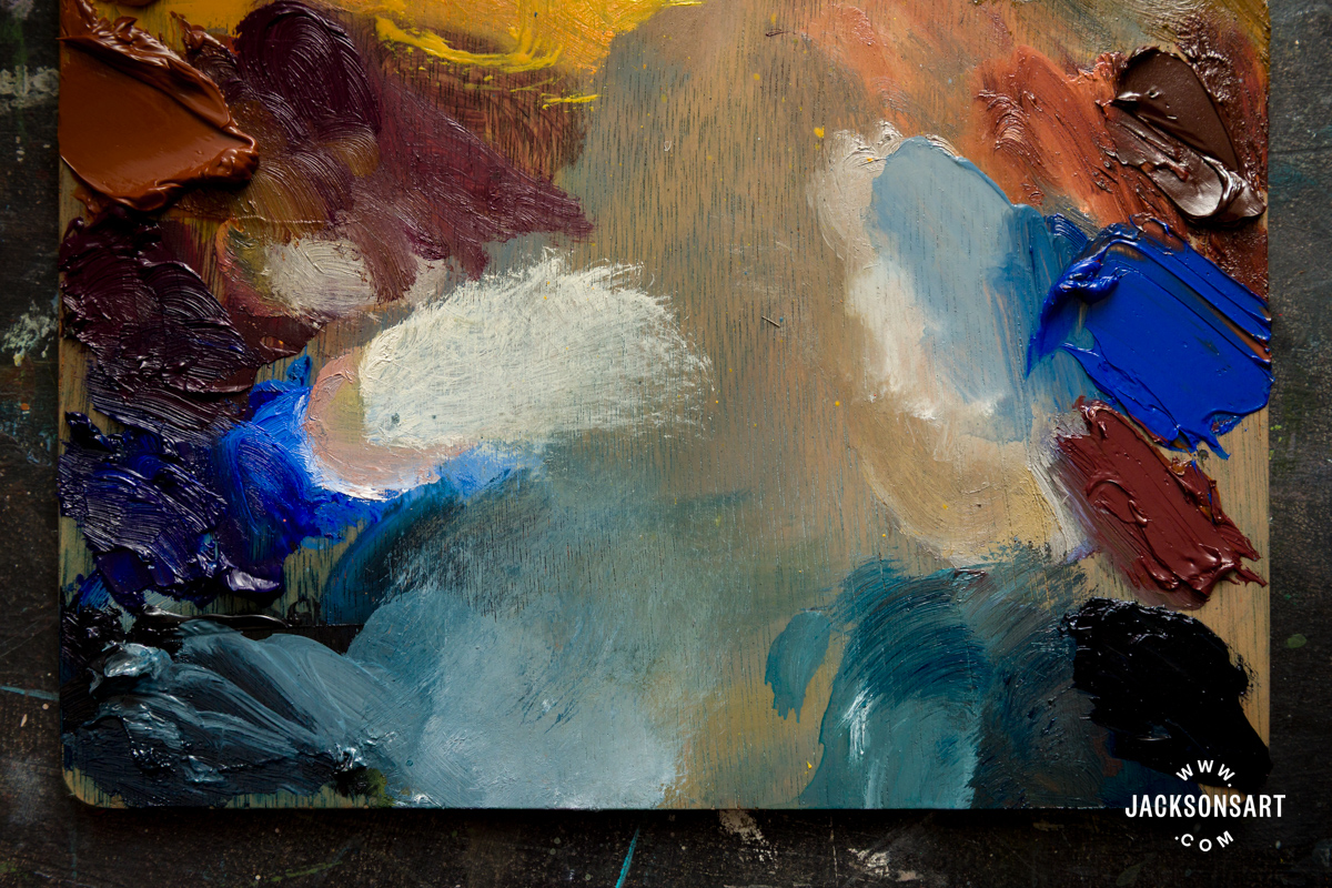 Firstly, I wished to assemble a oil palette which, so far as doable, makes use of pigments that might have been acquainted to Turner. Sadly, this emits most of his yellow and crimson pigments, besides pure and artificial ochres. Lots of Turner’s blues are nonetheless in frequent use at the moment, so there have been tons to select from. However Ultramarine and Cobalt Blue are comparatively comparable in hue and worth, so I made a decision to decide on one medium valued heat blue (Cobalt Blue) and a darkish valued green-blue (Prussian Blue).