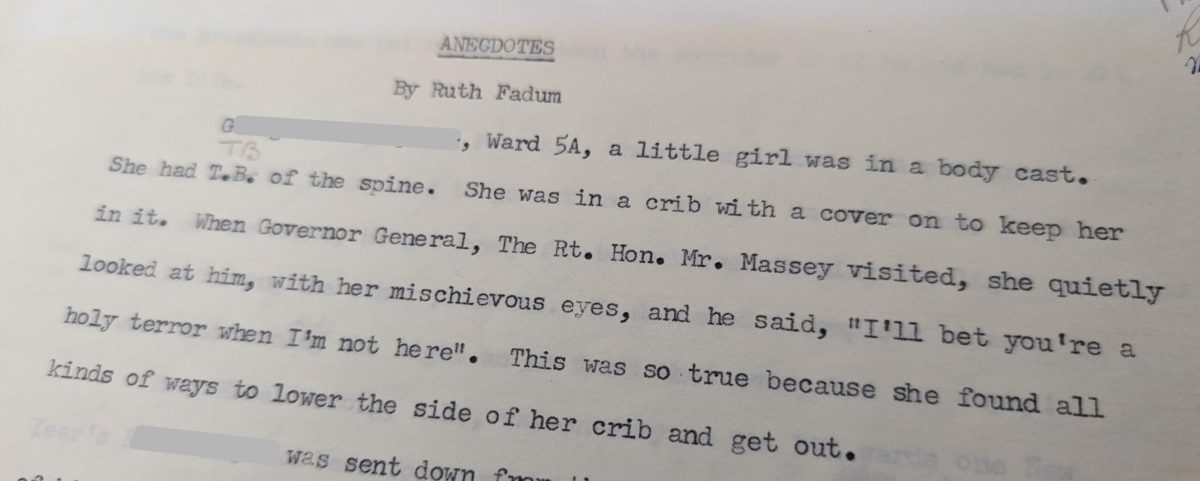 Photo of a typed passage. It reads "Anecdotes by Ruth Fadum. G[redacted], Ward 5A, a little girl was in a body cast. She had T.B. of the spine. She was in a crib with a cover on to keep her in it. When Governor General, The Rt. Hon. Mr. Massey visited, she quietly looked at him, with her mischievous eyes, and he said, "I'll bet you're a holy terror when I'm not here." This was so true because she found all kinds of ways to lower the side of her crib and get out. [Redacted] was sent down from..." The remainder of the text is cut off.