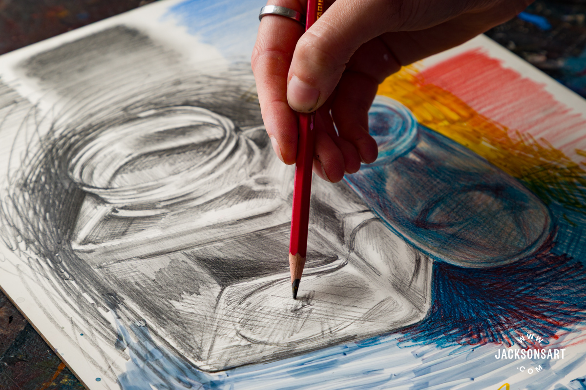 Subsequent, I used an assortment of colored pencils for the smaller jar on the best – Caran d’Ache Museum Aquarelle Pencil in Gentle Cadmium Purple, Faber-Castell Polychromos Pencil in Deep Cobalt Inexperienced, Holbein Artists’ Colored Pencil in Apricot, and two Derwent Procolour Pencils in Midnight Blue and Center Ultramarine.
