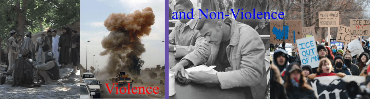 (Header picture: from left to proper, all through Wikipedia: Taliban fighters in 2021, a car-bombing in Iraq in 2005, a non-violent scholar sit-in in North Carolina in 1960 and an anti-ICE protest in Minneapolis, January 2026.)