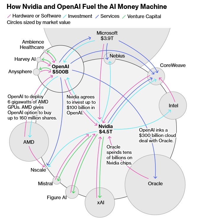 For report corporations experimenting with generative or analytic AI, the most important danger is probably not the mannequin itself—it’s the seller internet wrapped round it…not mentioning any names, in fact. And after I say “wrapped round” the circularity is getting ridiculous. Right here’s a diagram of the AI bubble’s round economics courtesy of Looking for Alpha: